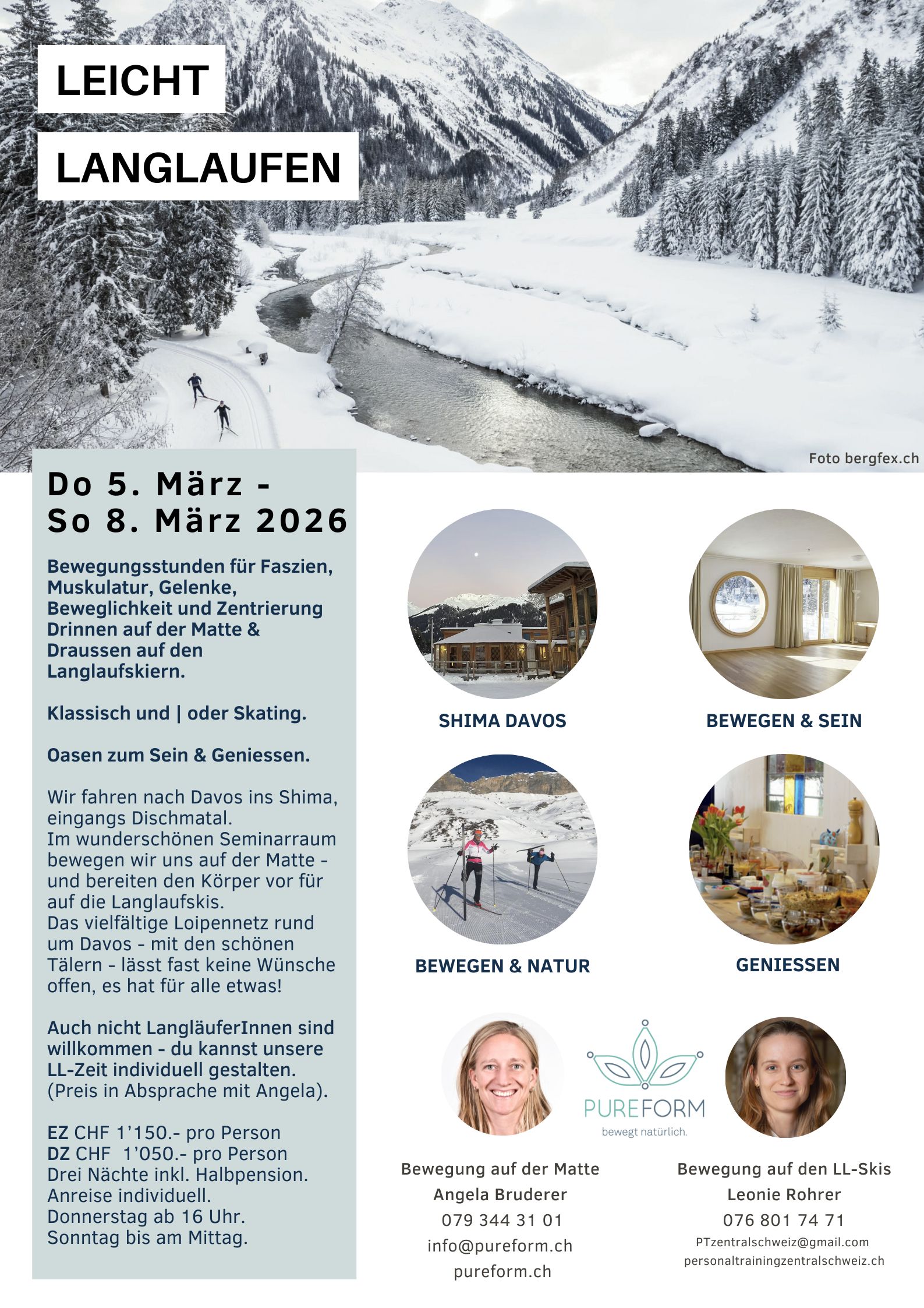 Wir fahren nach Davos ins Shima, eingangs Dischmatal. Im wunderschönen Seminarraum bewegen wir uns auf der Matte - und bereiten den Körper vor für auf die Langlaufskis.